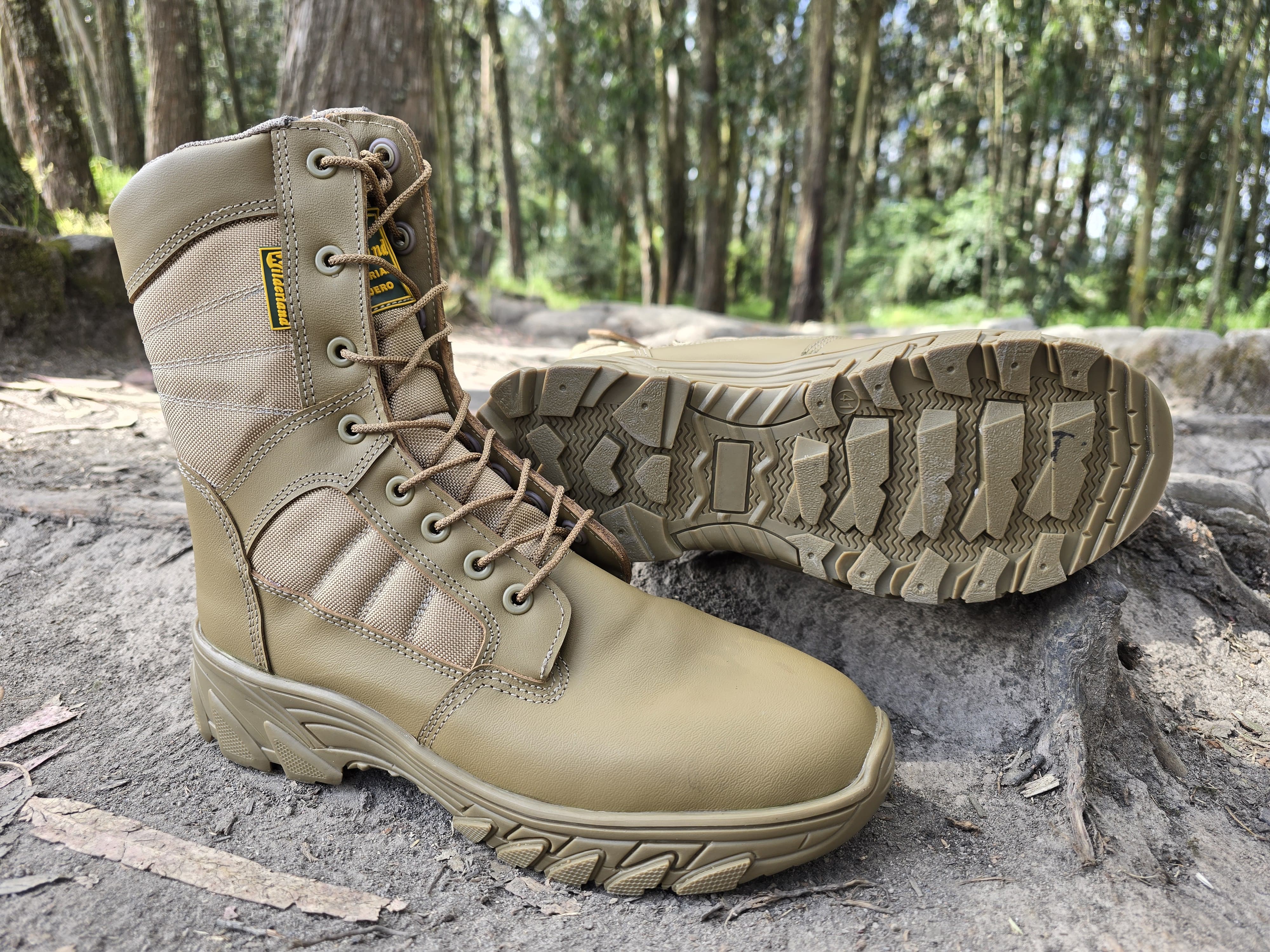 Su forro textil interno acolchado, antibacterial y microperforado, permite una ventilación óptima y confort térmico durante todo el día. La plantilla ergonómica de PU es extraíble y adaptable, ideal para usuarios que necesitan comodidad sin sacrificar estabilidad. El diseño de caña alta (14 a 17 cm) brinda soporte completo al tobillo, ideal para actividades tácticas o de seguridad.